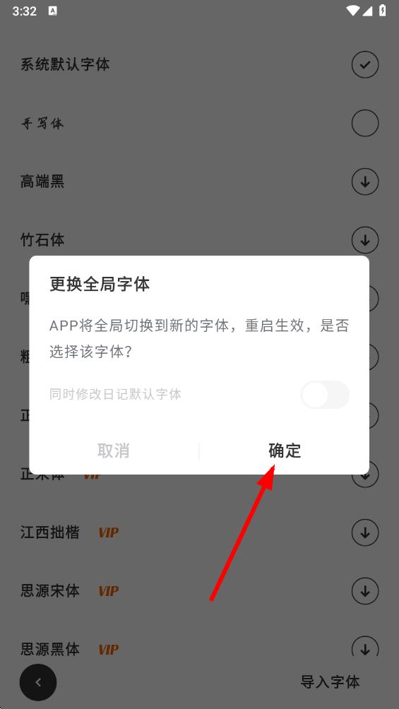 4、下載完成后點擊,彈出的更換全局字體提示框中點擊確定,重啟app后即可應用手寫字體。