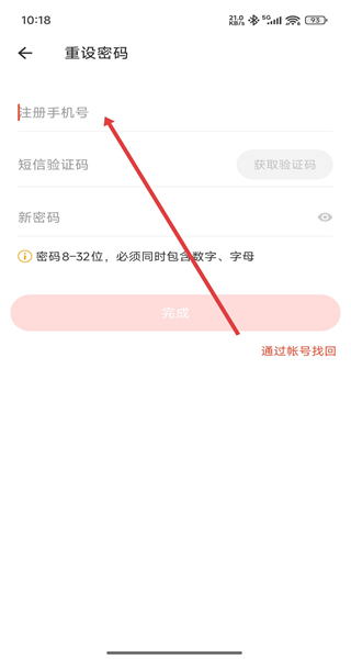 4、在重設(shè)密碼頁面輸入注冊手機(jī)號,點(diǎn)擊“獲取驗(yàn)證碼”并輸入,設(shè)置新密碼,點(diǎn)擊“完成”,完成密碼重置操作。