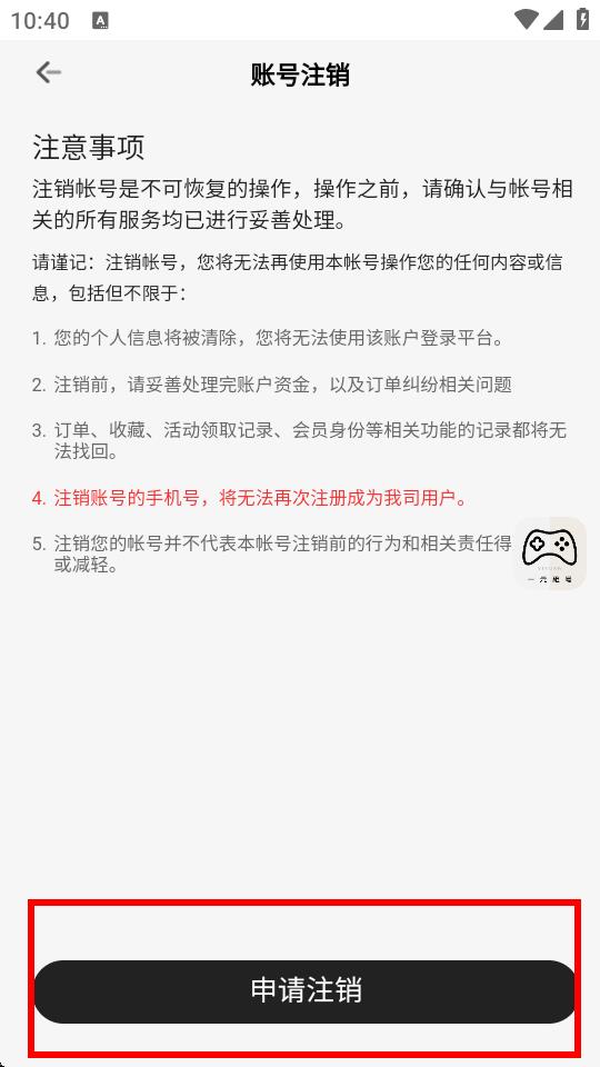 3、進入賬號注銷頁面,仔細(xì)閱讀注意事項,確認(rèn)已妥善處理與賬號相關(guān)的所有服務(wù),如賬戶資金、訂單糾紛等問題,點擊申請注銷。