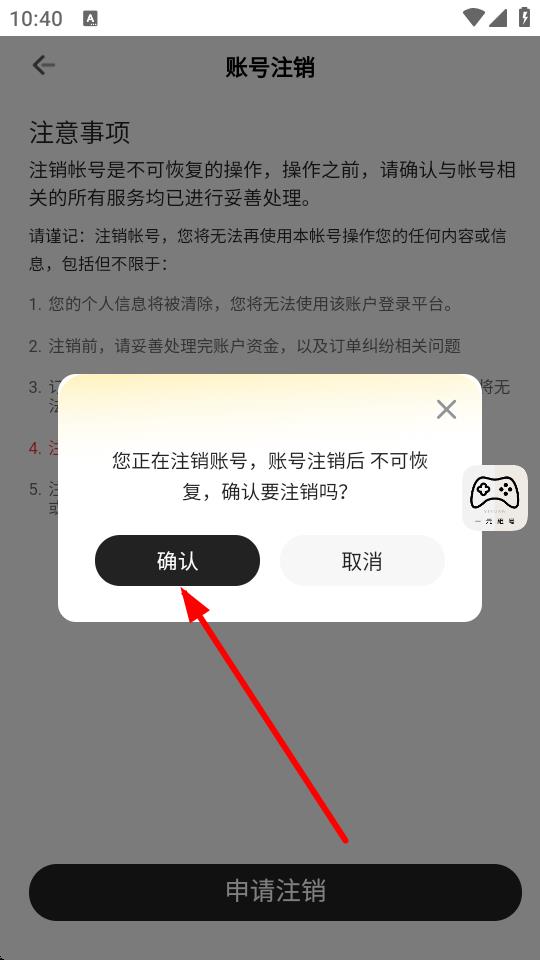 4、在彈出的確認(rèn)窗口中,點擊確認(rèn),即可完成賬號注銷操作。