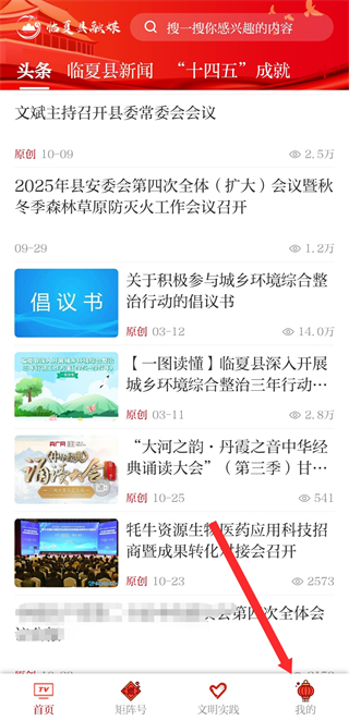 1、打開臨夏縣融媒APP首頁,點擊底部我的,進(jìn)入個人的頁面。