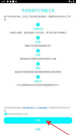 1、打開尺子測量工具APP,進(jìn)入時會彈出歡迎語以及用戶協(xié)議,點擊同意的按鈕。