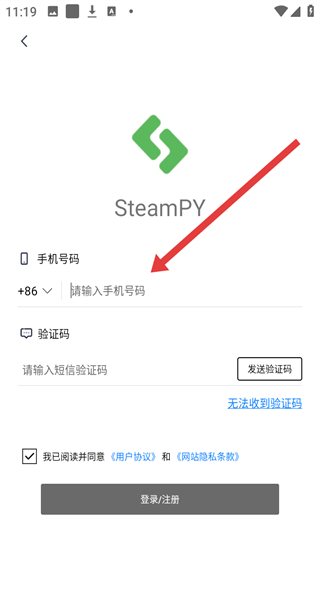 3、在登錄頁面勾選“我已閱讀并同意”并輸入手機(jī)號(hào)碼后,點(diǎn)擊“發(fā)送驗(yàn)證碼”。