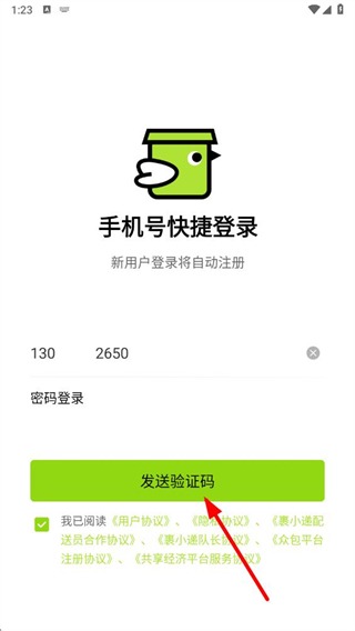 2、進(jìn)入登錄頁面,輸入手機(jī)號碼,點擊發(fā)送驗證碼按鈕。
