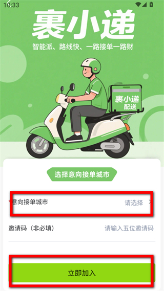 1、在裹小遞頁面,選擇意向接單城市并填寫邀請碼非必填后,點擊立即加入按鈕。