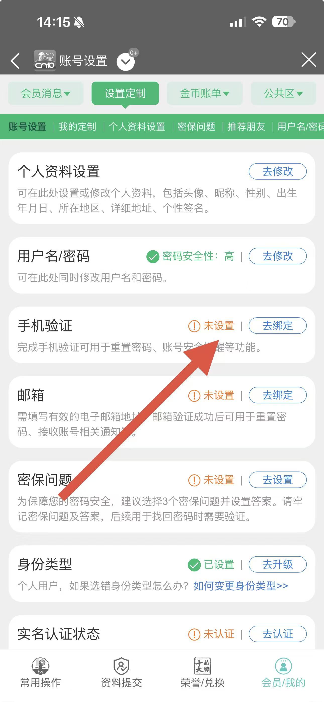 3、在賬號(hào)設(shè)置界面里,找到手機(jī)驗(yàn)證欄,點(diǎn)擊右側(cè)的去綁定。