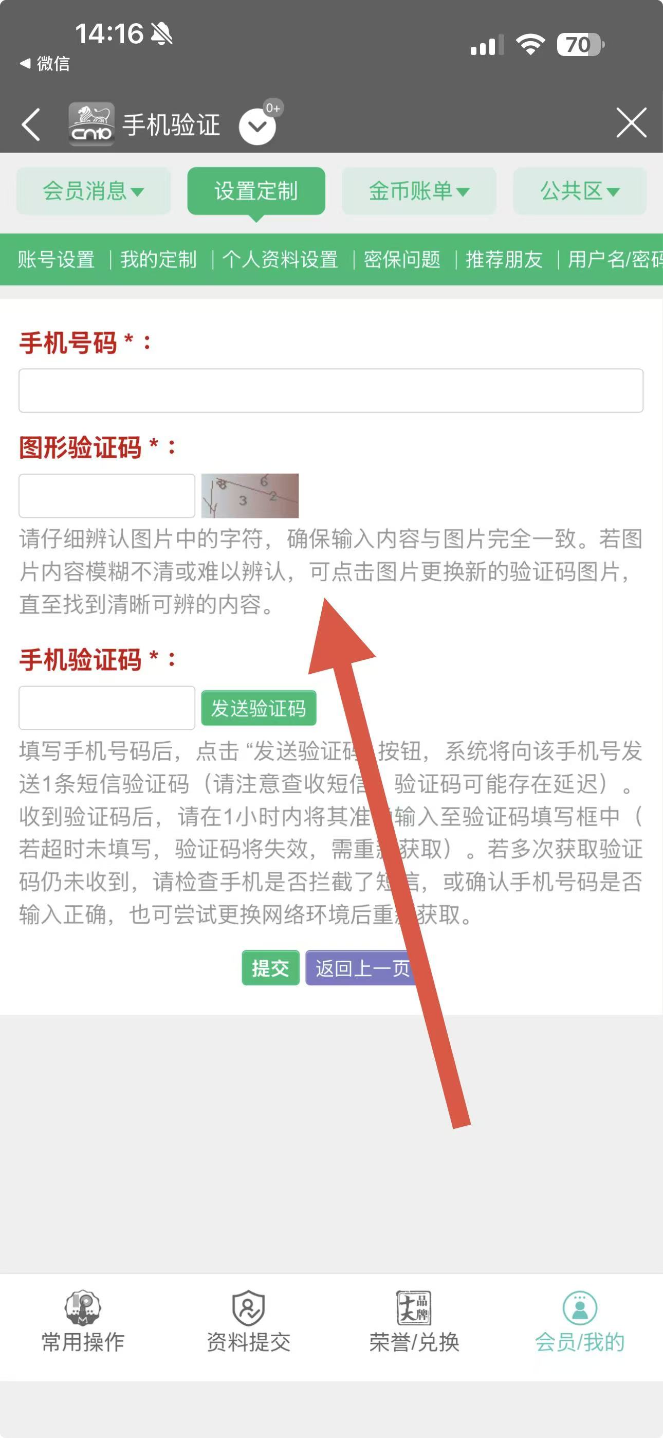 4、在手機(jī)驗(yàn)證頁(yè)面,依次填寫(xiě)信息,點(diǎn)擊發(fā)送驗(yàn)證碼獲取手機(jī)驗(yàn)證碼并填入,最后點(diǎn)擊提交,即可完成手機(jī)號(hào)碼的綁定。