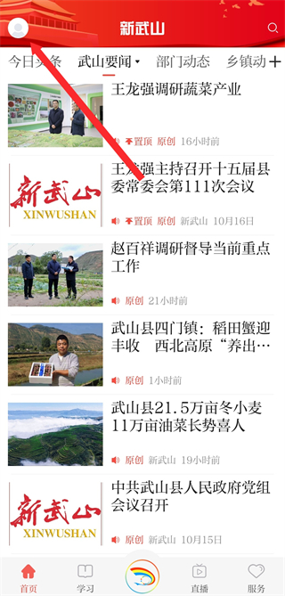 1、打開新武山APP首頁,點(diǎn)擊左上角頭像,進(jìn)入個(gè)人的頁面。