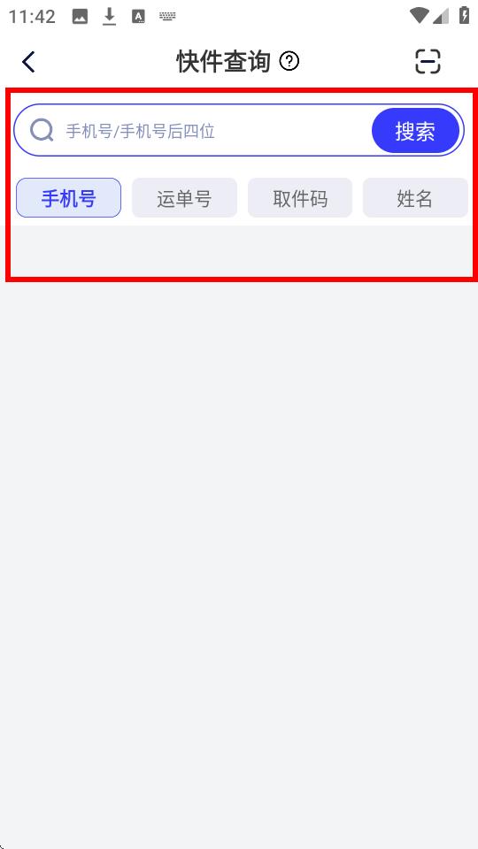 2、進(jìn)入快件查詢界面,可以在搜索框輸入手機(jī)號或手機(jī)號后四位,也能點(diǎn)擊下方的運(yùn)單號、取件碼、姓名,按對應(yīng)方式準(zhǔn)確輸入信息獲取快遞狀態(tài)。