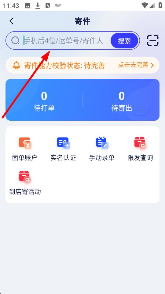 3、首頁中的寄件選項(xiàng)在頂部搜索框輸入手機(jī)后4位、運(yùn)單號、寄件人搜索相關(guān)信息,之后便可選擇手動錄單等方式發(fā)起寄件。