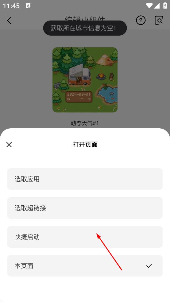 3、觸發(fā)“打開頁面”彈窗后,按需選擇選取應用、選取超鏈接、快捷啟動等方式,配置組件打開頁面邏輯。