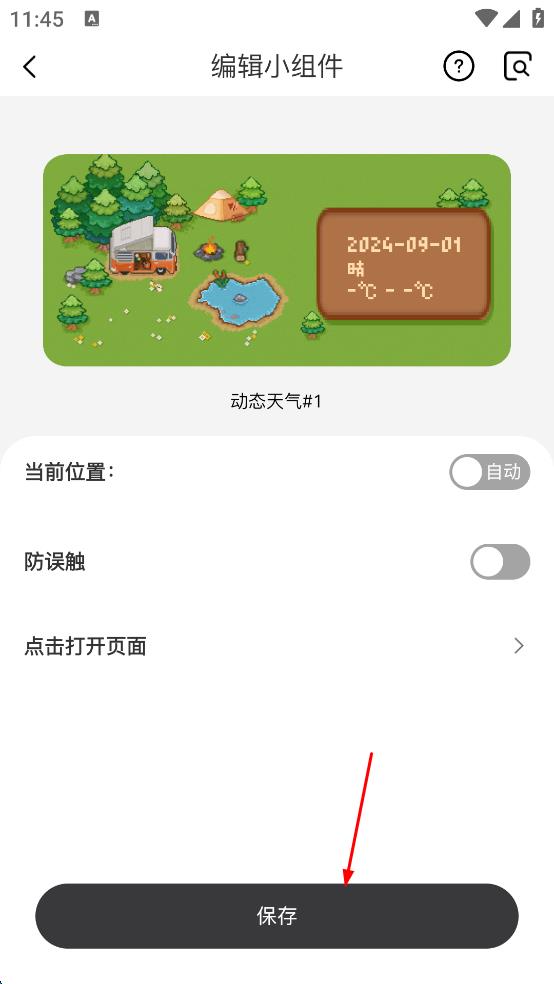 2、在編輯小組件界面,設置當前位置、防誤觸等功能,確認無誤后點擊“保存”按鈕,保存組件設置。