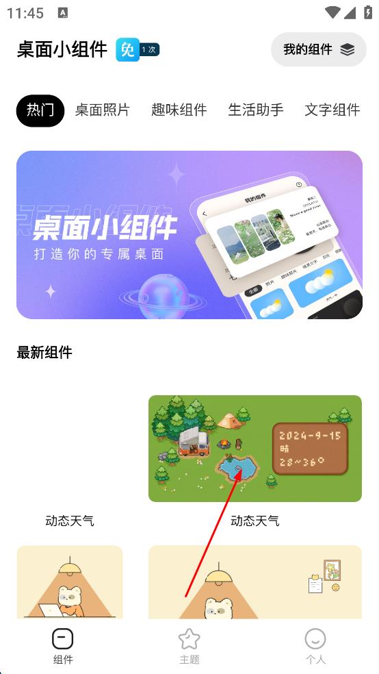 1、進入桌面小組件頁面,在熱門分類中找到“動態(tài)天氣”組件,點擊進入編輯小組件界面。