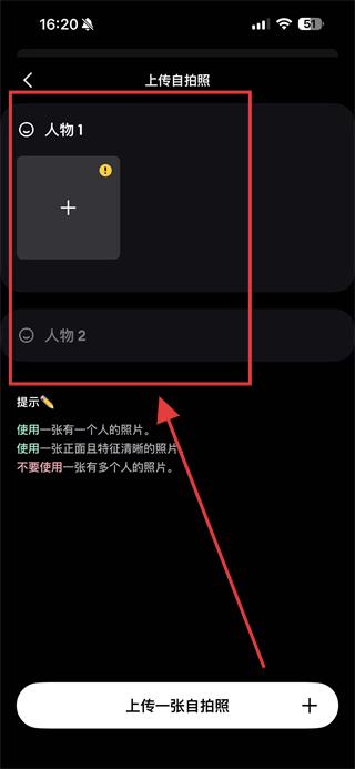 2、在上傳自拍照界面,分別為人物1和人物2上傳對應的自拍照。