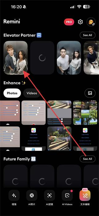 1、打開Remini應用,點擊Elevator Partner板塊中的模板進入編輯流程。