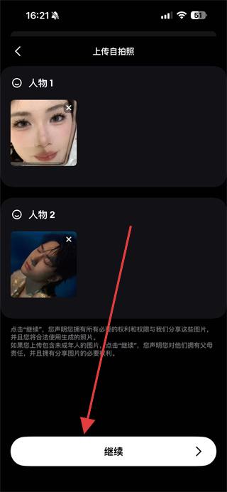 3、兩張自拍照上傳完成后,點擊界面底部的繼續(xù)按鈕,等待應用生成效果。