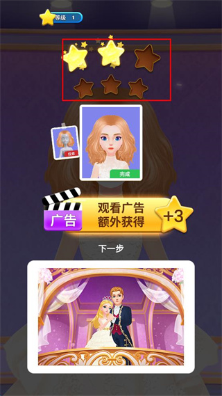 4、查看星級評價,可選擇觀看廣告額外獲得星星,之后點擊下一步繼續(xù)游戲。