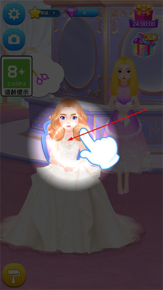 1、點擊畫面中提示的人物區(qū)域,進入美發(fā)操作環(huán)節(jié)。
