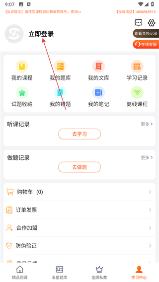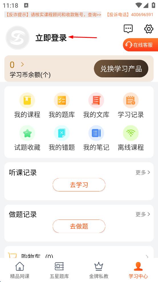 3、在“學習中心”頁面,找到“立即登錄”字樣并點擊,進入賬號登錄界面。