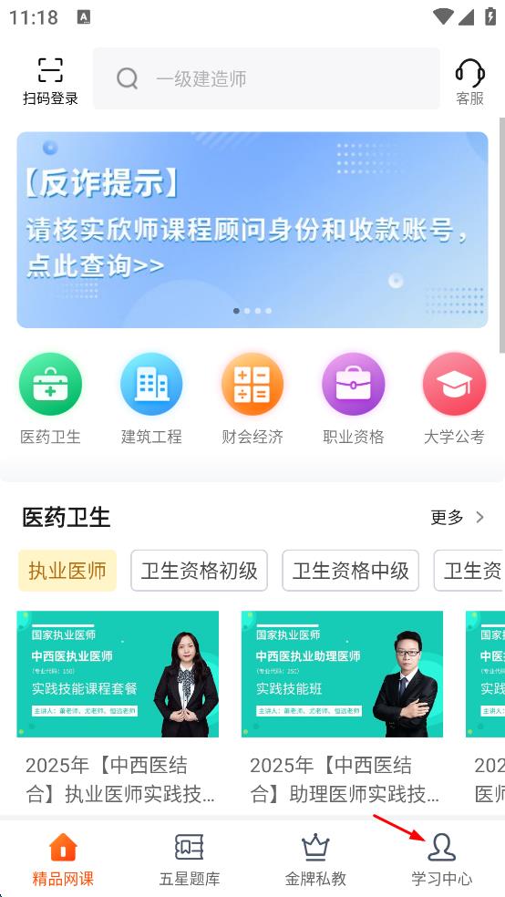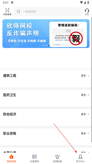 2、進入APP首頁后,點擊頁面右下角的“學習中心”選項。