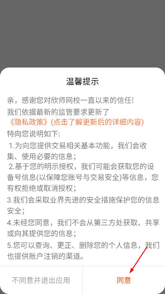 1、打開欣師網(wǎng)校APP,在彈出的“溫馨提示”窗口中,點擊“同意”按鈕。