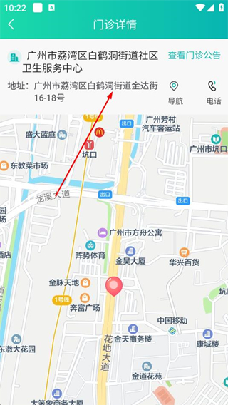 3、進(jìn)入該門診的詳情頁面后,即可查看對(duì)應(yīng)的門診地址及地圖位置。