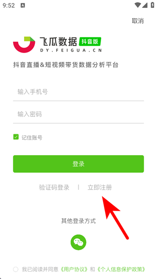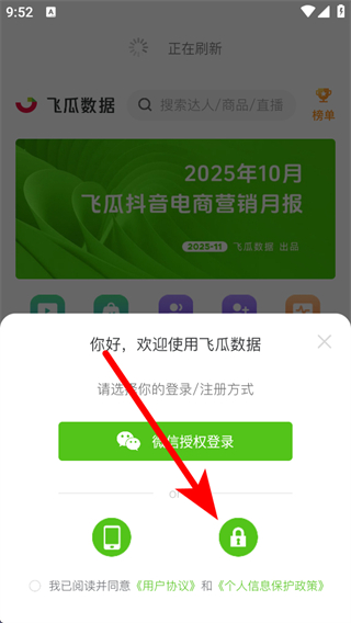 1、打開(kāi)飛瓜數(shù)據(jù)APP,在登錄選擇界面點(diǎn)擊密碼登錄。