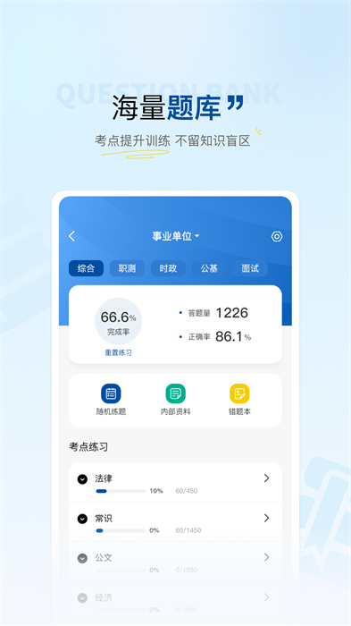 根據(jù)目標(biāo)考試的考點、難度,智能出題,通過記錄用戶練習(xí)情況,生成數(shù)據(jù)評估報告,預(yù)測考分。