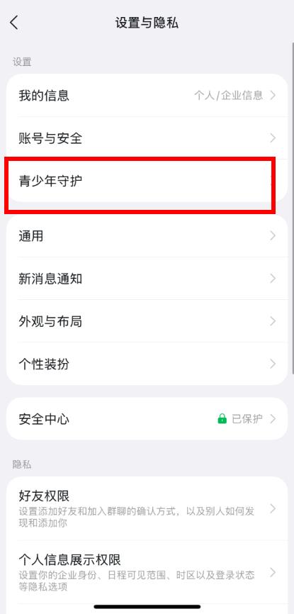 2、在設(shè)置與隱私界面中,點(diǎn)擊青少年守護(hù)。