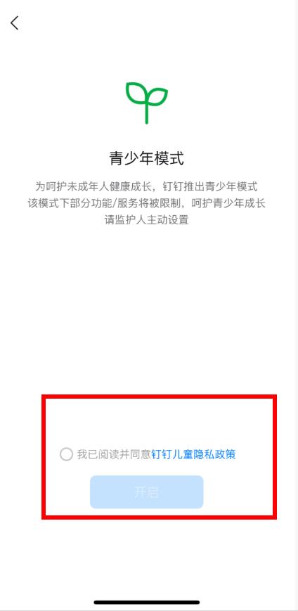 4、在青少年模式界面,閱讀相關(guān)說(shuō)明后,勾選我已閱讀并同意釘釘兒童隱私政策,再點(diǎn)擊開(kāi)啟即可成功開(kāi)啟青少年模式。