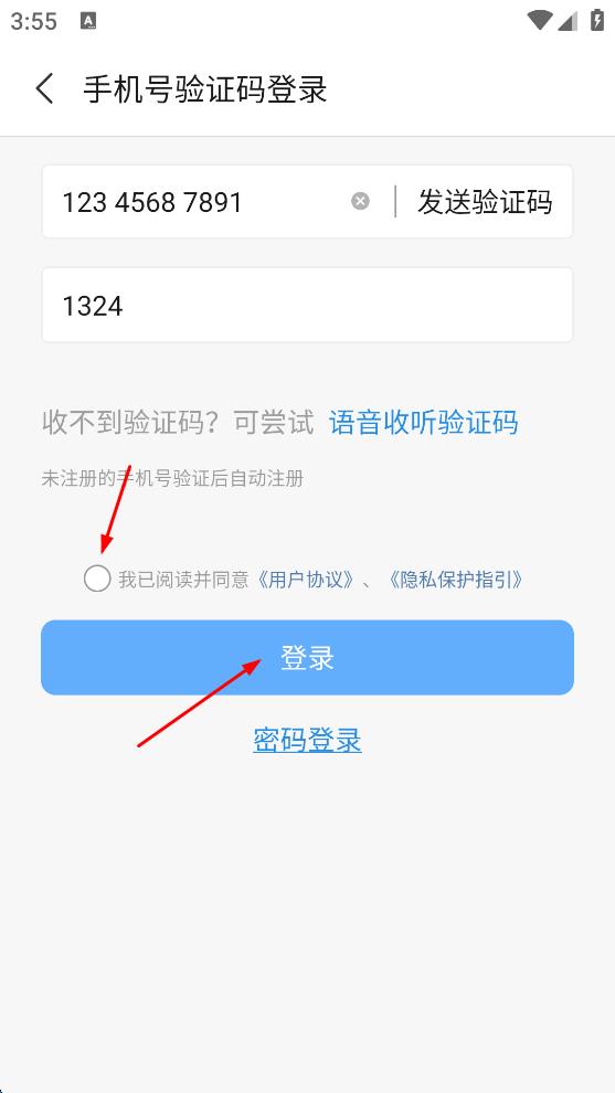 4、輸入好手機號和驗證碼后,勾選我已閱讀并同意用戶協(xié)議,隱私保護(hù)指引,最后點擊“登錄”按鈕,完成學(xué)習(xí)軟件的手機號驗證碼登錄操作。