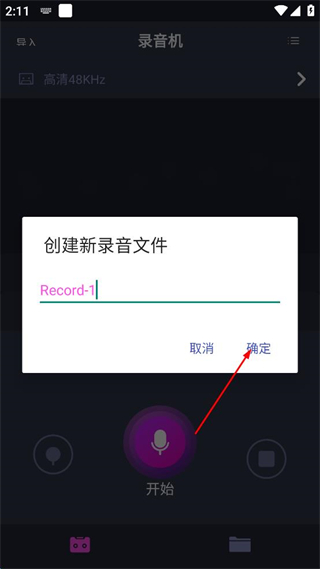 3、點擊“開始”按鈕,彈出創(chuàng)建新錄音文件的彈窗。