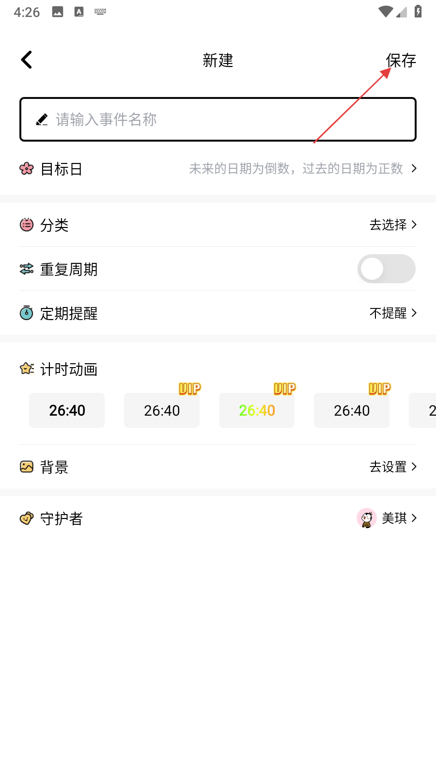 3、在輸入框中填寫事件名稱,點(diǎn)擊目標(biāo)日選擇事件對(duì)應(yīng)的日期,按需設(shè)置參數(shù),設(shè)置完成后點(diǎn)擊右上角保存按鈕,事件即創(chuàng)建成功。