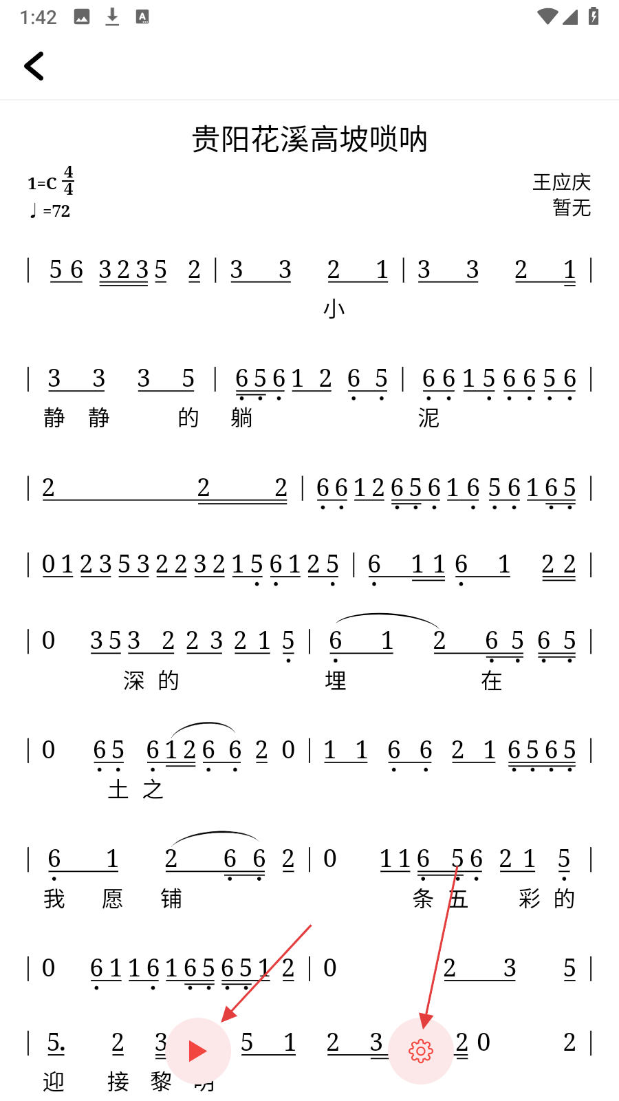 2、在簡譜詳情頁面,點(diǎn)擊底部紅色三角形播放按鈕,可播放簡譜對應(yīng)的音頻或動(dòng)態(tài)演示,點(diǎn)擊齒輪狀設(shè)置按鈕,可展開功能選項(xiàng)。