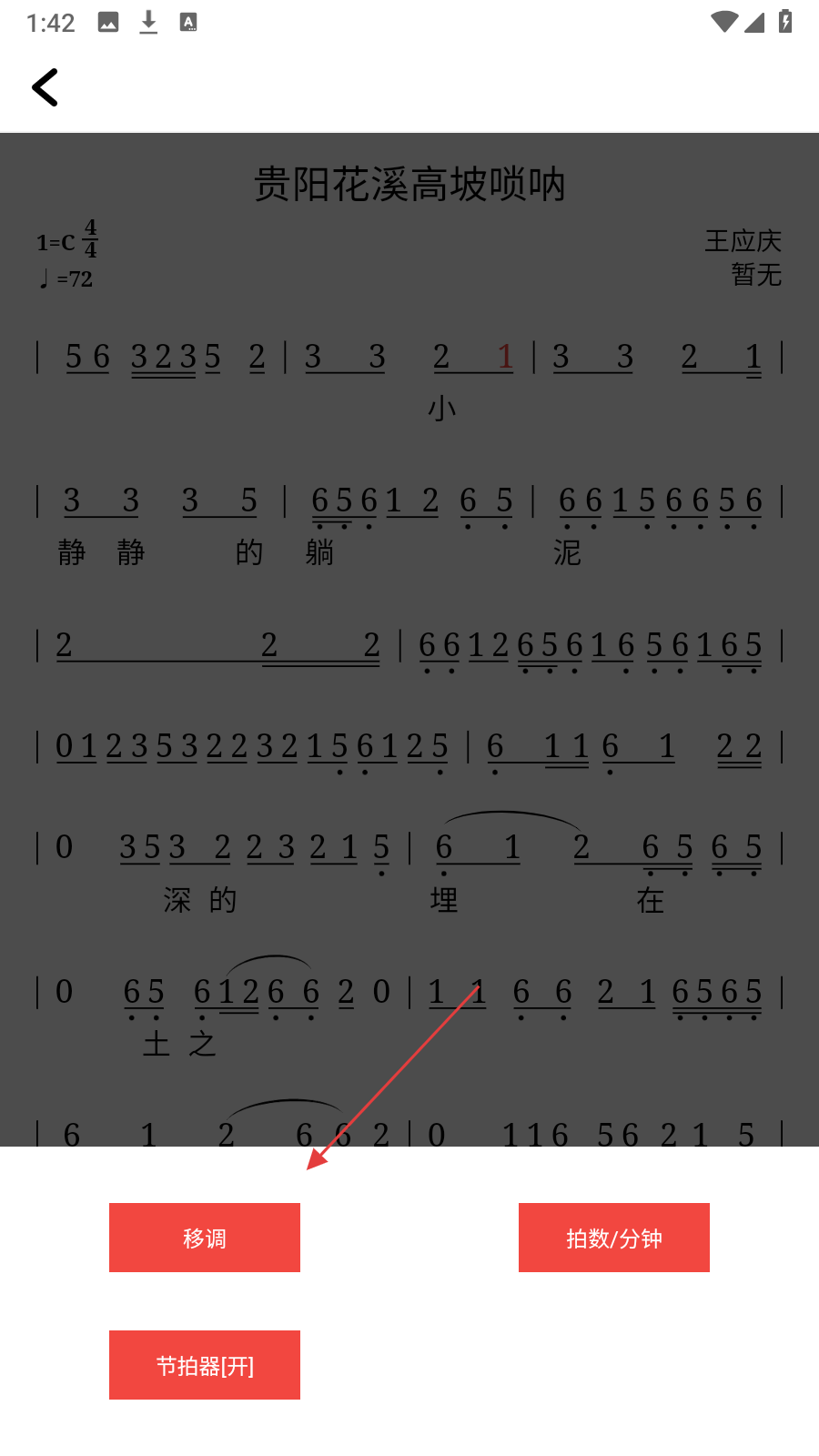 3、在展開的功能選項(xiàng)中,可點(diǎn)擊移調(diào)調(diào)整音高,點(diǎn)擊拍數(shù)設(shè)置節(jié)拍速度,點(diǎn)擊節(jié)拍器控制節(jié)拍器開關(guān),按需設(shè)置以輔助學(xué)習(xí)。