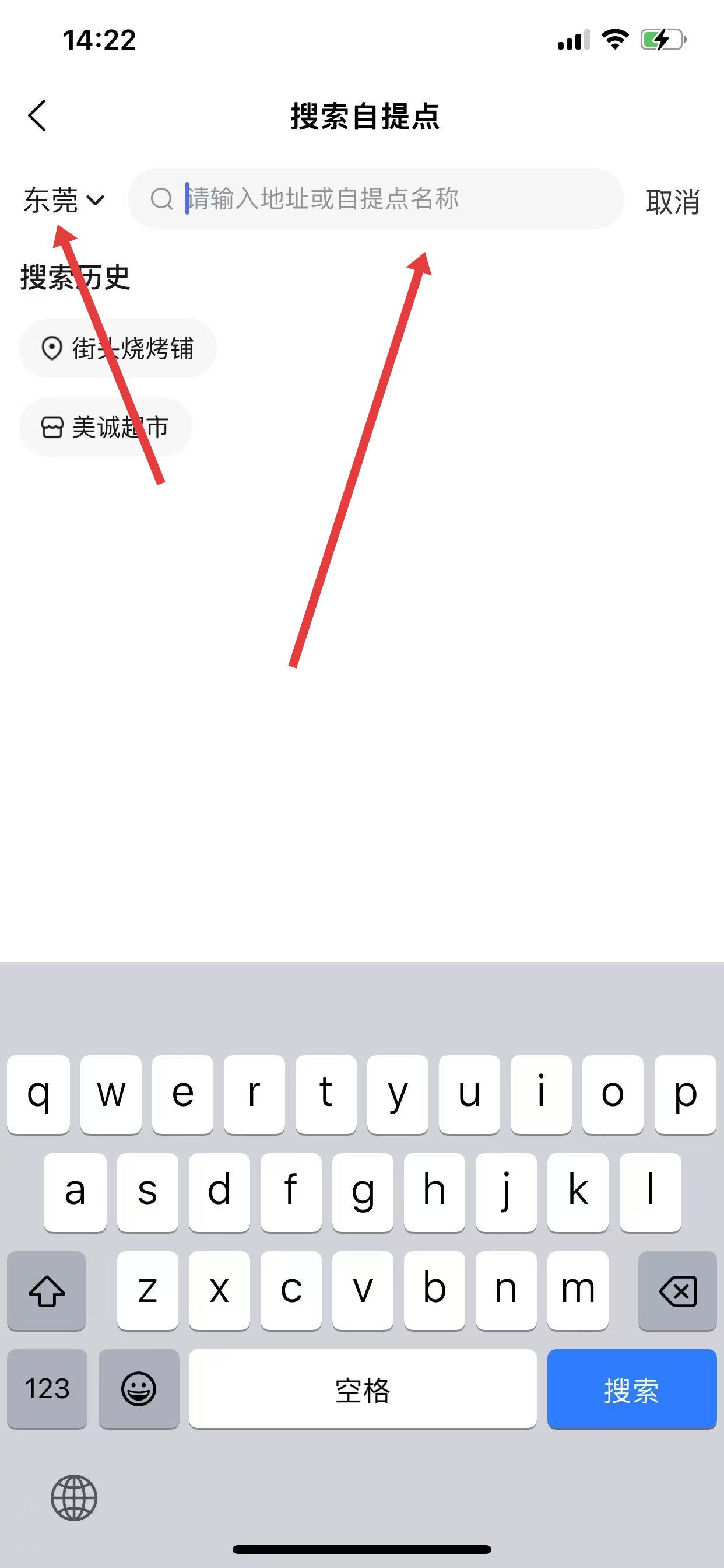 3、在搜索自提點(diǎn)頁面,點(diǎn)擊左上角城市名稱,選擇要定位的城市,再輸入自提點(diǎn)名稱。