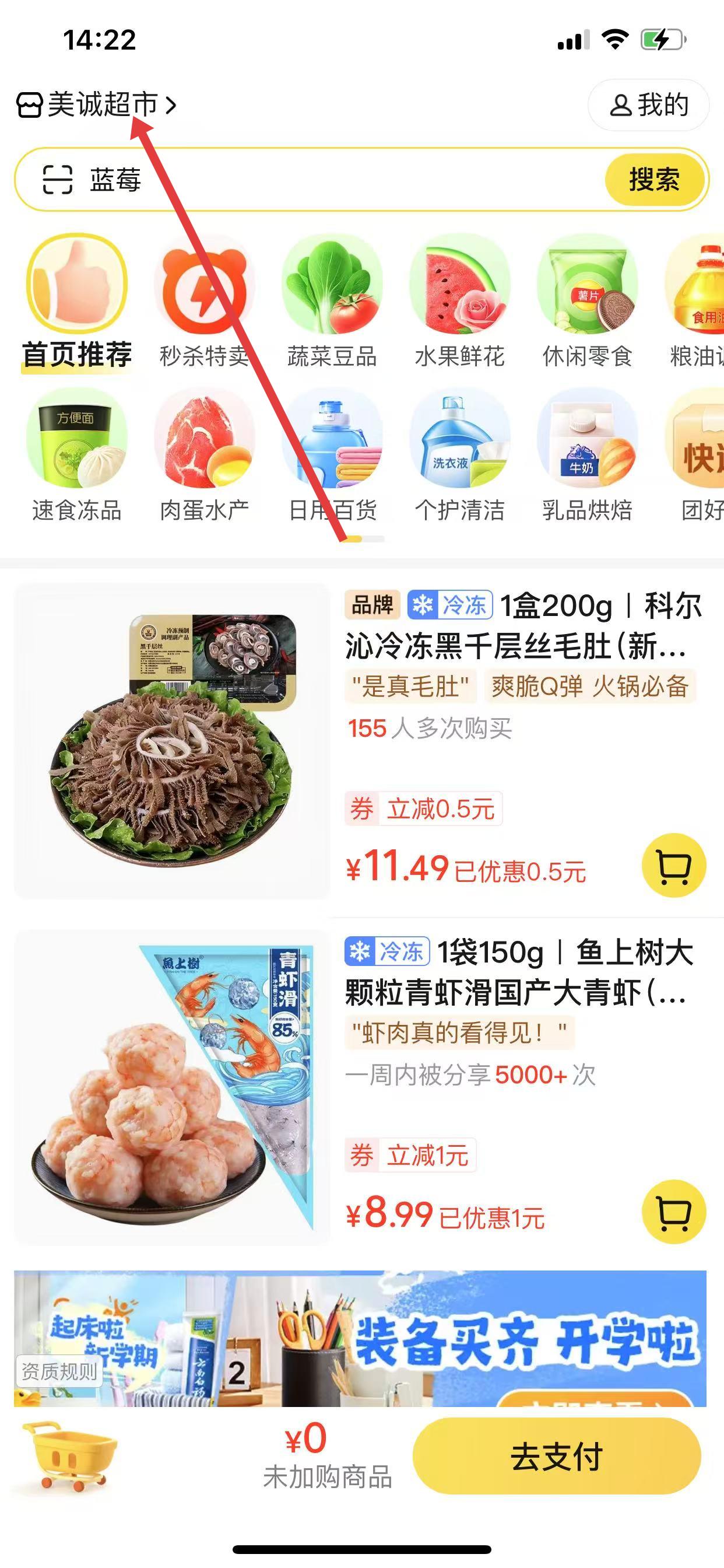 1、打開美團優(yōu)選界面,點擊左上角顯示當前位置的字樣。
