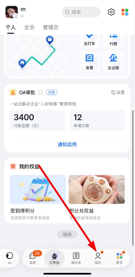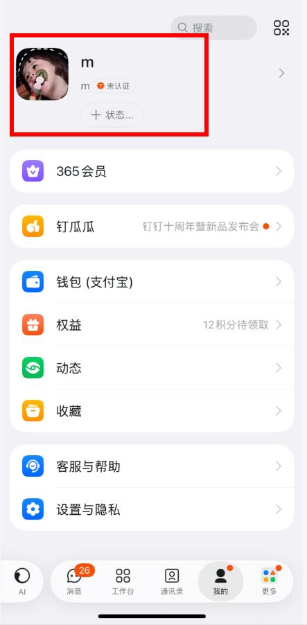 1、打開(kāi)釘釘應(yīng)用,點(diǎn)擊底部導(dǎo)航欄中的我的進(jìn)入個(gè)人頁(yè)面。
