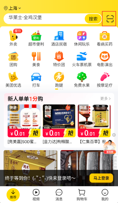 1、首先打開下載好的美團(tuán)外賣APP,進(jìn)入軟件后在右上角的位置即可看到掃一掃的功能選項(xiàng),點(diǎn)擊一下即可進(jìn)行掃描;
