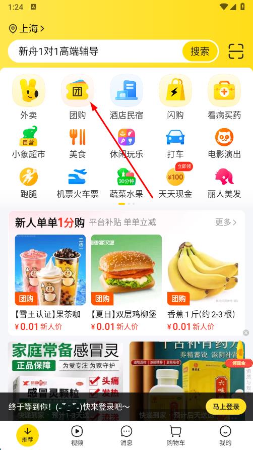 1、打開美團(tuán)APP,進(jìn)入首頁(yè),點(diǎn)擊團(tuán)購(gòu)圖標(biāo),進(jìn)入團(tuán)購(gòu)頁(yè)面。