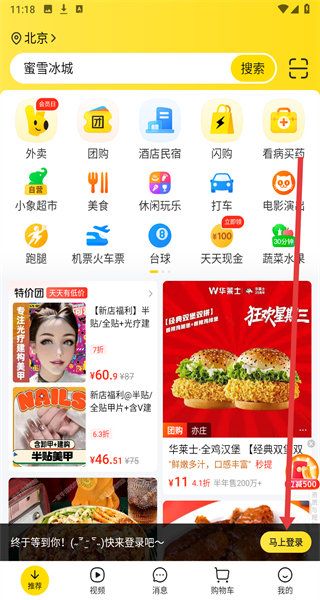 1、打開美團(tuán)APP,點(diǎn)擊馬上登錄,進(jìn)入登錄頁(yè)面。