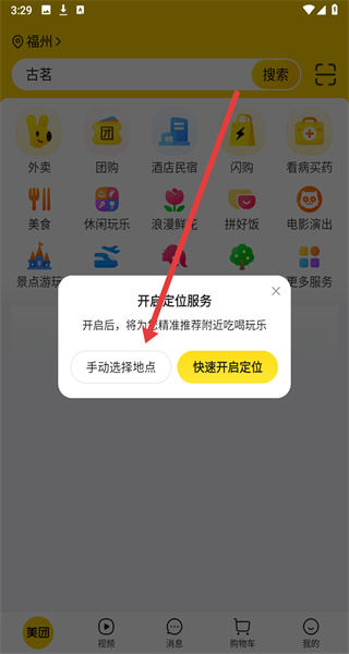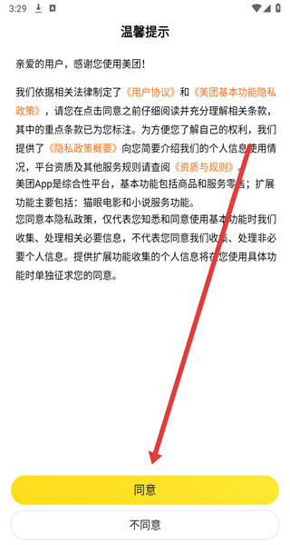 1、在打開美團(tuán)App后,可以點(diǎn)擊溫馨提示彈窗中的同意按鈕,進(jìn)入使用。