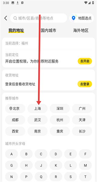 3、在選擇城市頁(yè)面中,可以手動(dòng)點(diǎn)擊上海按鈕,定位到該城市。