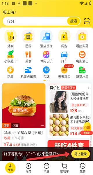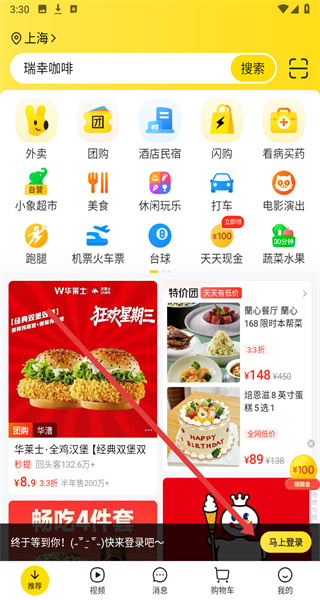 4、在完成定位位置后,可以點(diǎn)擊馬上登錄按鈕,進(jìn)行登錄操作后點(diǎn)外賣。