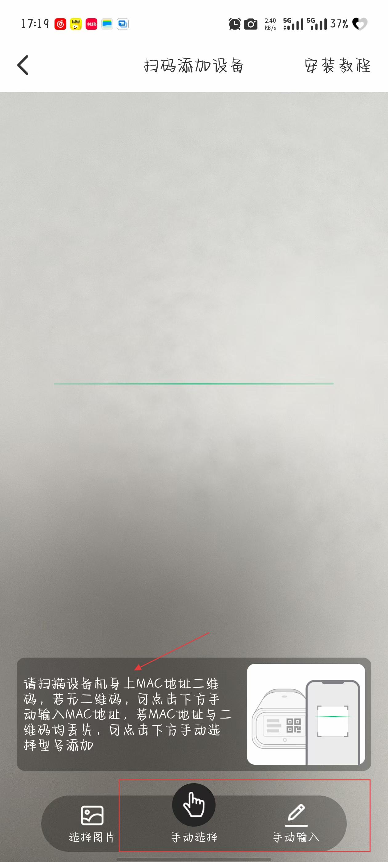 2、在掃碼添加設備頁面,若設備機身上有MAC地址二維碼,可直接掃描,若無二維碼,點擊手動選擇或手動輸入選項。
