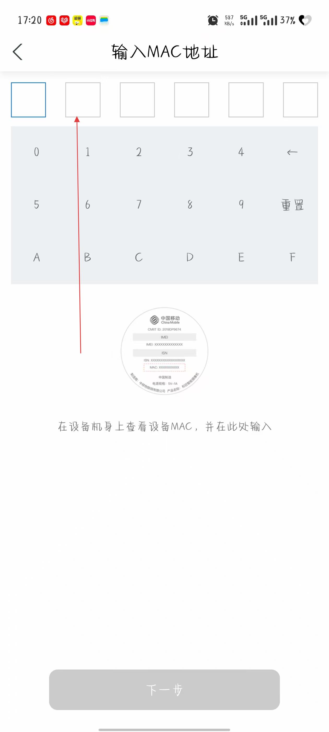 4、若選擇手動輸入MAC地址,在設備機身上查看MAC地址并依次輸入,輸入完成后點擊下一步,按照提示完成后續(xù)設備添加流程。
