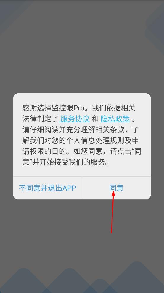 1、打開監(jiān)控眼Pro,在彈出的服務(wù)協(xié)議和隱私政策提示框中,點(diǎn)擊“同意”,進(jìn)入登錄頁面。