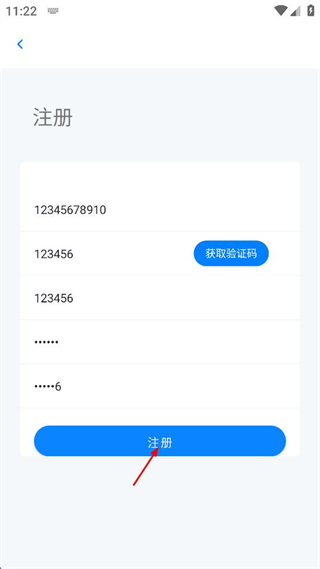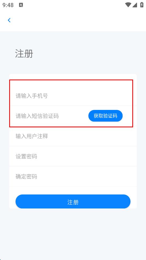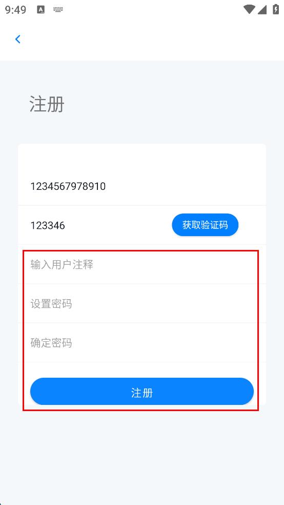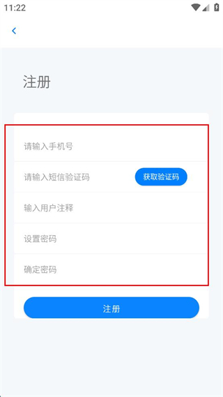 3、在注冊界面依次輸入手機號、短信驗證碼、用戶注釋、設(shè)置密碼、確定密碼。