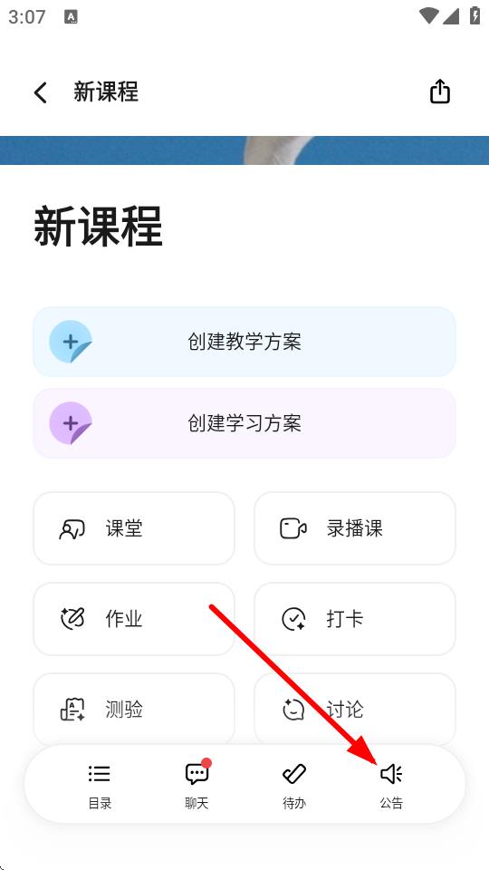 2、在班級(jí)的新課程頁面,點(diǎn)擊底部公告按鈕,進(jìn)入公告界面。