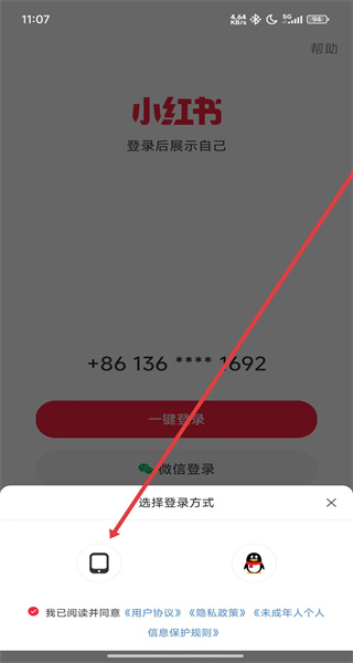 1、在小紅書選擇登錄方式彈窗中,點擊手機圖標,進入本機號碼相關(guān)的登錄頁面。